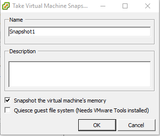 Criando o snapshot com essa opção marcada, é utilizado o VSS do VMware Tools para “preparar” a máquina para um estado de backup. Ou seja, aplicações que sofrem constante modificação e guardam informação na memória (SQL, Exchange) serão avisadas que irá ocorrer um backup e qualquer dado na memória será escrito em disco para aí então ocorrer o snapshot. Isso garante que o snapshot esteja íntegro em caso de reversão. Você só pode utilizar essa opção caso a VM tenha o VMware Tools instalado, caso contrário o processo não irá funcionar.