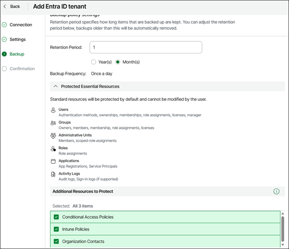 Por padrão o VDC sempre vai proteger os Usuários, Grupos, Admin Units, Roles, Application e Logs, mas podemos selecionar para proteger recursos adicionais: Conditional Access Policies, Intune Policies e Organization Contacts.
