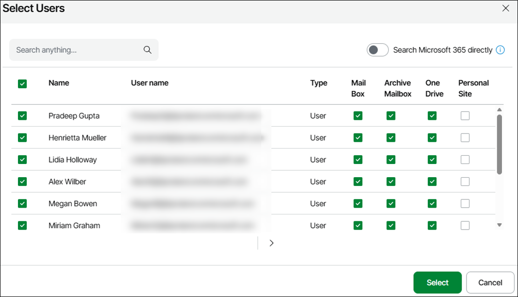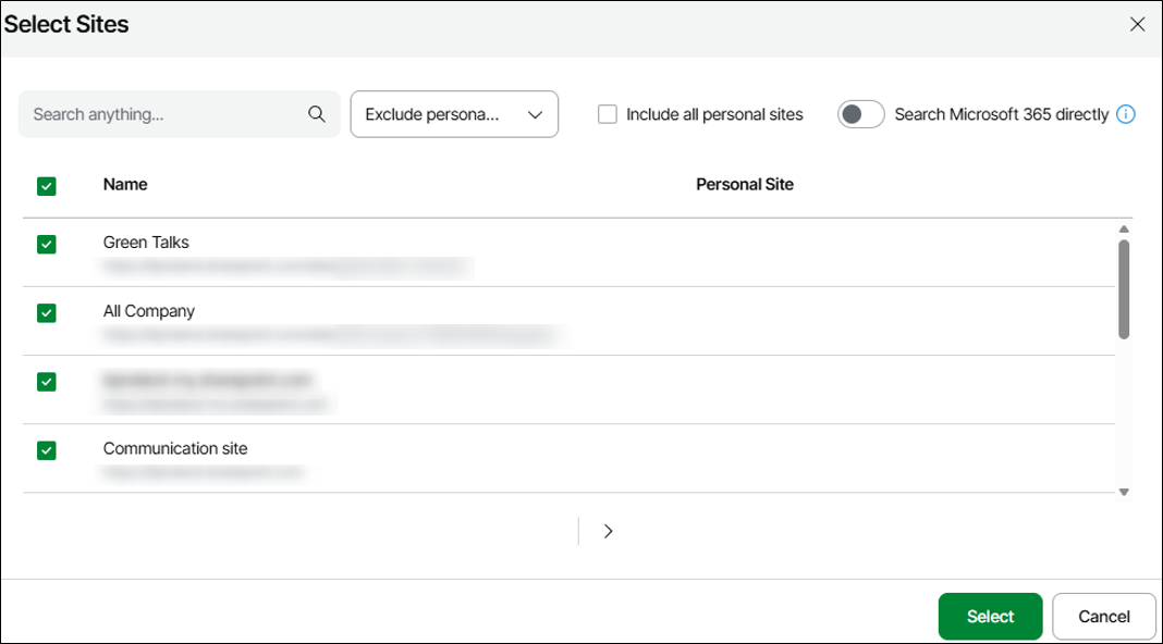 No meu caso escolhi todas as Mailboxes, OneDrive e alguns sites do SharePoint.