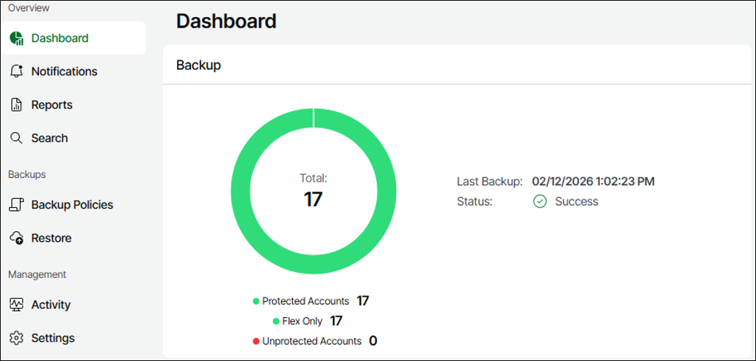 Ao finalizar, voltando no Dashboard, veremos a quantidade de contas protegidas, o tipo de licença que está sendo utilizada e o resultado do último backup.