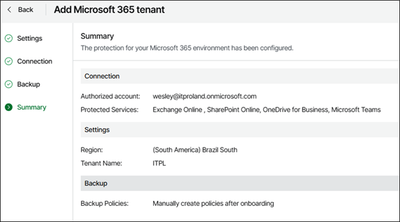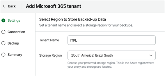 Primeiro será solicitado para escolher o nome de Tenant e a região. A região influencia onde o repositório com os dados do backup serão armazenados.