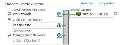- O nome do Port Group que está associado com a rede da VM que será migrada no ESXi tem que ter o mesmo nome no ESXi de destino. Caso contrário, o VEEAM não encontrará a rede que a VM pertencia e consequentemente subirá sem rede. No meu caso, como é um ambiente de lab, tenho um único Port Group nos dois ESXi por isso não precisei me preocupar com isso. Segue exemplo: