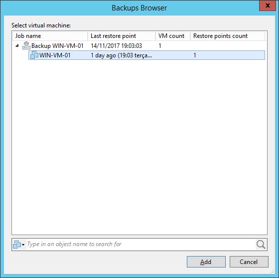 Escolha a VM que deseja restaurar. Se você tiver mais de um restore point poderá escolher qualquer um deles, assim você pode voltar com a VM em qualquer ponto dos seus últimos backups. No meu caso tenho apenas um restore point. Clique em “Add”: